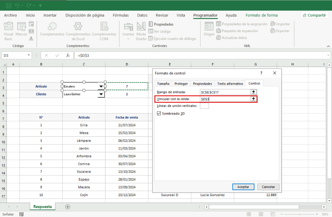 Solución: Debes hacer clic derecho en el control y en "Formato de control" verificar la "Vinculación con la celda". Sin esta celda vinculada, las fórmulas de búsqueda no recibirán la señal para actualizarse.