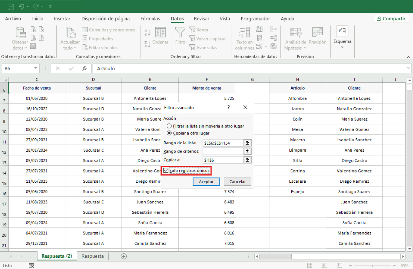Solución: Asegúrate de marcar la casilla "Solo registros únicos" en el cuadro de diálogo de Filtro Avanzado antes de presionar aceptar.